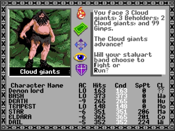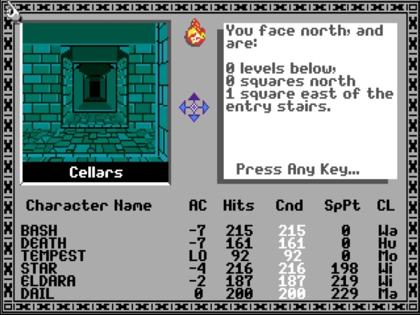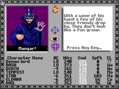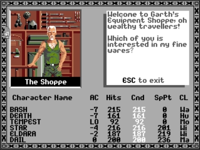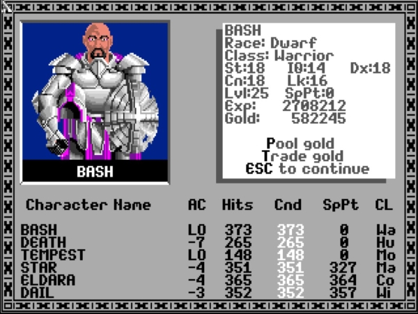 Character creation 101. What surprises me most is that the process of creating a new character has not really changed in 20 years. You have more options now, but anyone familiar with a modern RPG will feel right at home. A closer look will show that they inherited the D&D armour class system of negative numbers, but added a bad idea of just showing "LO" if it was less then -9 for some reason. You can also see that these are screen shots of charaters at the end of the game where you have 100's of hitpoints.