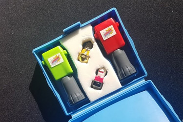 Each of the tops fits into a wind up spinner. The top of the case is bowl shaped. Wind them up and drop them into the bowl. The last top spinning wins.
